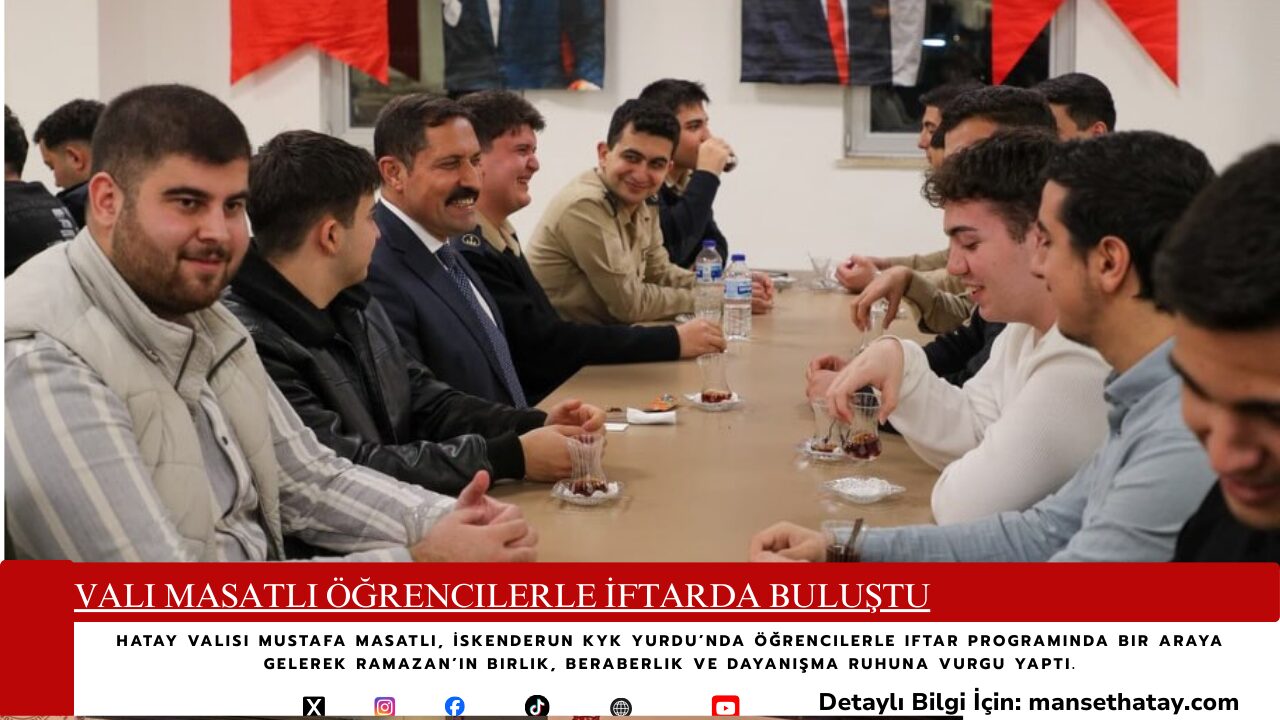 Hatay Valisi Mustafa Masatlı, İskenderun KYK Yurdu’nda öğrencilerle iftar programında bir araya gelerek Ramazan’ın birlik, beraberlik ve dayanışma ruhuna vurgu yaptı.