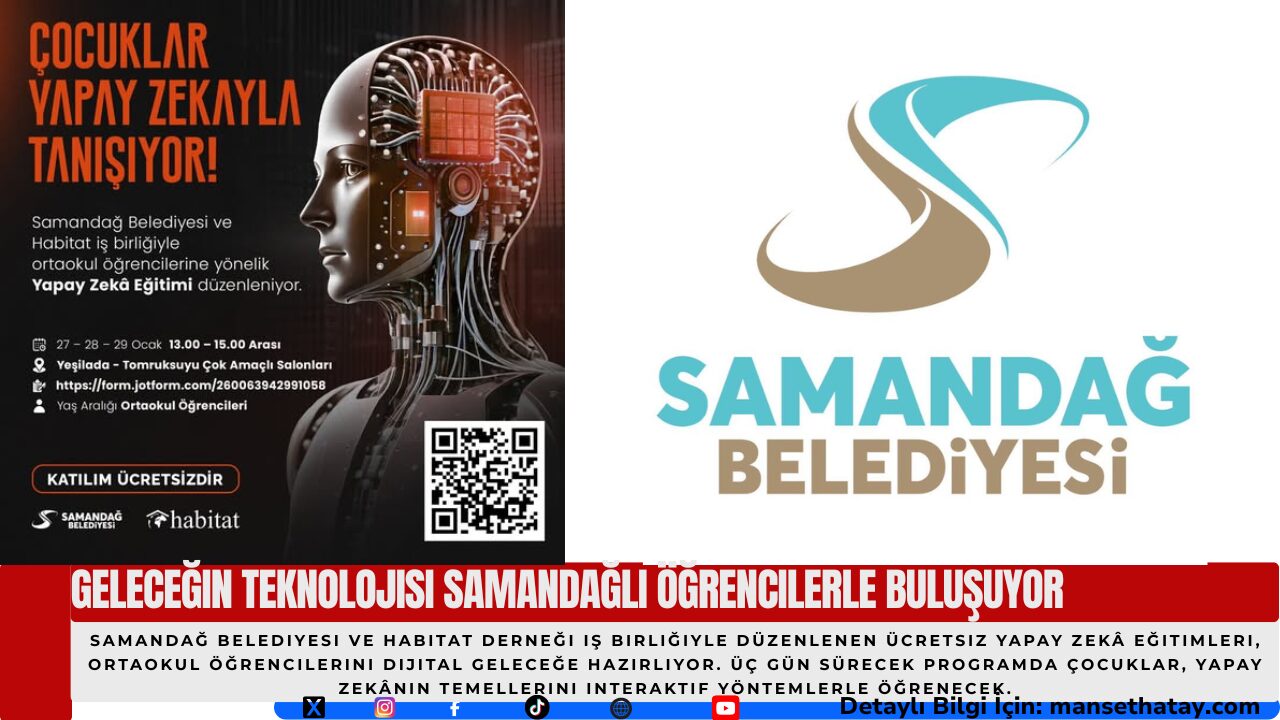 Samandağ Belediyesi ile Habitat Derneği iş birliğinde hayata geçirilen yeni eğitim programı, ortaokul öğrencilerini yapay zekâ dünyasıyla tanıştırmaya hazırlanıyor. “Çocuklar Yapay Zekâyla Tanışıyor!” başlığıyla düzenlenen bu ücretsiz etkinlik, gençlerin dijital becerilerini güçlendirmeyi ve teknolojiye bilinçli bir bakış kazandırmayı amaçlıyor.