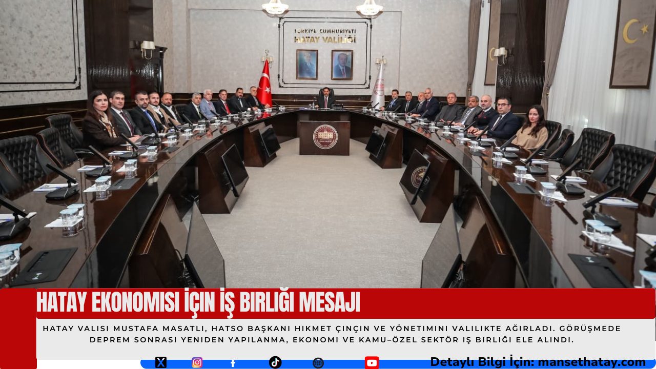 Hatay Valisi Mustafa Masatlı, Hatay Ticaret ve Sanayi Odası (HATSO) Yönetim Kurulu Başkanı Hikmet Çinçin ve beraberindeki yönetim kurulu üyelerini Valilik makamında kabul etti. Gerçekleşen ziyarette, deprem sonrası yeniden yapılanma süreci başta olmak üzere Hatay’ın ekonomik geleceği, yatırım ortamının güçlendirilmesi ve kamu–özel sektör iş birliği masaya yatırıldı.