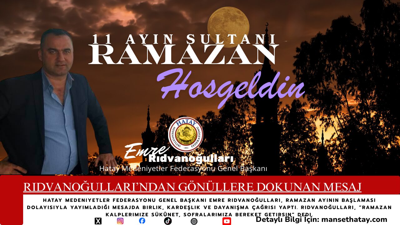 On bir ayın sultanı Ramazan-ı Şerif’in gelişiyle birlikte tüm dünyada manevi bir heyecan yaşanırken, Hatay Medeniyetler Federasyonu Genel Başkanı Emre Rıdvanoğulları da yayımladığı mesajla bu coşkuya ortak oldu.