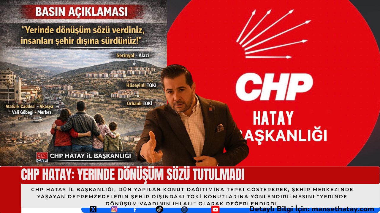 CHP Hatay İl Başkanlığı, merkezden şehir dışına yönlendirme politikasını kabul etmediklerini vurgulayarak, yerinde dönüşüm sözünün tutulmasını, oluşan mağduriyetlerin giderilmesini ve sürecin yeniden, şeffaf bir şekilde değerlendirilmesini talep etti. Açıklama, “Bu mağduriyet görmezden gelinemez. Sessiz kalmayacağız” ifadeleriyle sona erdi.