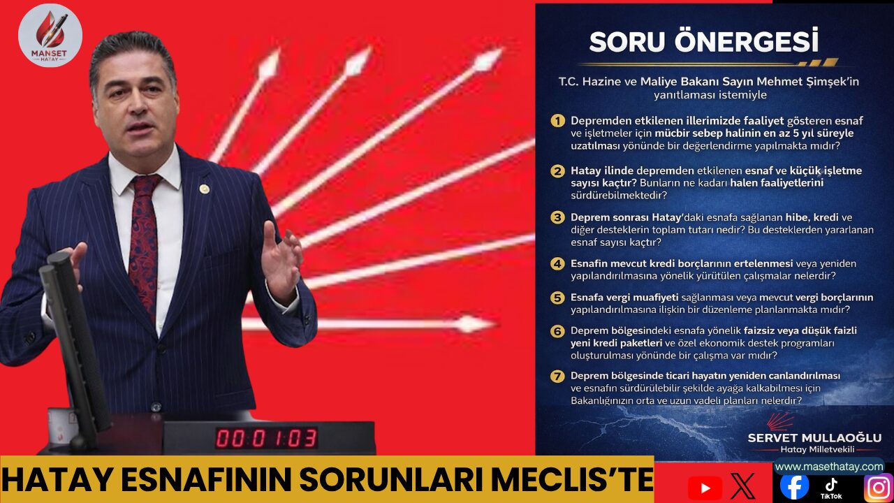CHP Hatay Milletvekili Servet Mullaoğlu, 6 Şubat depremlerinin ardından ekonomik olarak toparlanma mücadelesi veren Hatay esnafının yaşadığı sorunları TBMM gündemine taşıdı. Özellikle işyerleri yıkılan ya da ağır hasar alan esnafın hâlâ büyük sıkıntılar yaşadığını belirten Mullaoğlu, bölgedeki ticari hayatın yeniden canlanması için acil destek gerektiğini ifade etti.